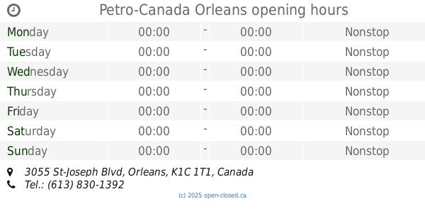 It is also possible to : Edit these OPENING HOURS of Station Petro-Canada In Orleans, 3055 St-Joseph Blvd,